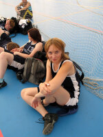 Катя, самый наш высокий игрок, та, что первый раз попробовала баскетмяч подержать чуть больше полугода назад - справилась, была в нужном месте в нужное время, даже 3 гола забила, из них один - штрафной. Прямо перед поездкой у нее была травма ноги. Но все обошлось.