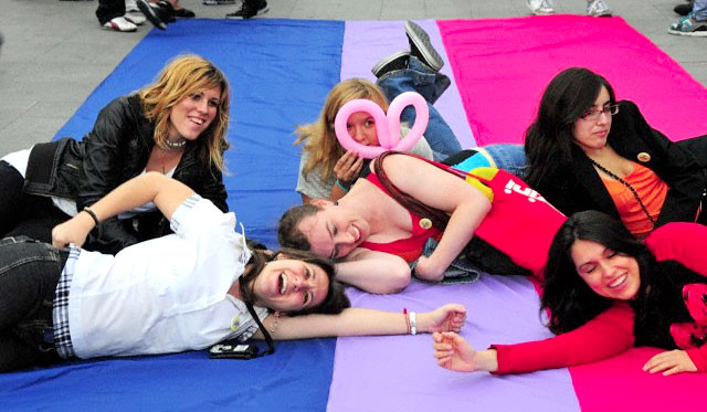 Флаг бисексуалов состоит из трех цветов: пурпурного, синего и фиолетового (День видимости бисексуалов в Мадриде)