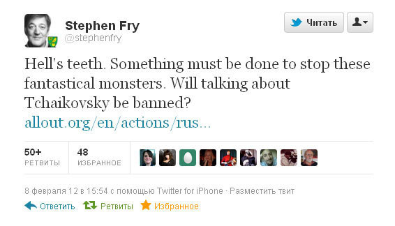 Свое возмущение происходящим выразили не только рядовые пользователи интернета, но и очень известные фигуры. К примеру, Стивен Фрай (Stephen Fry) - британский актер, писатель, публицист и философ, открытый гей. У себя в Твиттере он написал: "Черт подери! Нужно что-то делать, чтобы остановить этих фантастических монстров. Речь идет о том, что Чайковский будет запрещен?" После этого Фрай оставил ссылку на упоминавшуюся выше петицию на сайте ALL OUT, которую может подписать любой из вас.