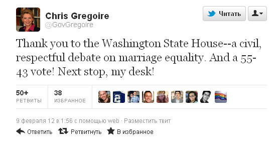 На прошлой неделе за законопроект о легализации однополых браков проголосовали в Сенате Вашингтона. Вчера он был вынесен на голосование в нижней палате легислатуры и также был одобрен 55 голосами "за" против 43 несогласных. Таким образом, Вашингтон становится седьмым американским штатом, где геи и лесбиянки смогут официально оформлять браки: дело лишь за подписью губернатора, Кристины "Крис" Грегуар (Christine Gregoire). А она заявляла, что подпишет его, еще с того момента, как законопроект начал рассматриваться в законодательном органе. Ожидается, что губернатор сделает это на следующей неделе и тем самым, по ее же собственным словам, "положит конец эпохе дискриминации".