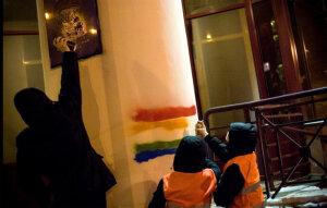 Сегодня ночью неизвестная группа, назвавшая себя "Анонимные геи, лесбиянки, бисексуалы и трансгендеры", провела в Москве серию акций. Здания ЦИК "Единой России" и Отдела внешних церковных связей РПЦ были разрисованы ЛГБТ-символикой.