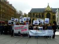 В Париже в полдень акция собрала более полусотни протестантов. Они вышли с плакатами и ЛГБТ-символикой к фонтану на площади Игоря Стравинского у Центра Жоржа Помпиду.