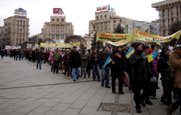 Восьмого марта в центре Киева активисты Всеукраинского союза общественных организаций "Украина для жизни" вышли на марш в защиту семейных ценностей, сообщает Vsenovosti.in.ua. По данным сайта, в марше приняли участие около 700 человек, и он стал ответом на акцию "Церкви и государству пора жить врозь!", которую в украинской столице в этот же день проводили представители левых и феминистских организаций.