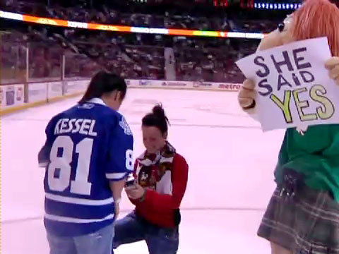 Как сообщает Рinkpaper.com, девушка по имени Кристина, поклонница клуба "Ottawa Senators", сделала предложение своей возлюбленной Алише, поклоннице "Toronto Maple Leafs". Это произошло в перерыве матча, в ходе которого встречались две этих прославленных команды. Девушки были одеты в униформу любимых клубов.