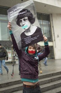 Сегодня 7 апреля в полдень у БКЗ Октябрьский в Санкт-Петербурге прошла серия одиночных пикетов, посвященных Дню молчания. В течение получаса 7 пикетирующих с заклеенными скотчем ртами, сменяя друг друга, выражали свое возмущение и протест против замалчивания дискриминации и насилия в отношении ЛГБТ, против гомофобии России, которая поставила геев и лесбиянок вне закона.
