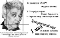 ЛГБТ-организация "Выход" обращает внимание участников акции на то, что формально - по закону - радужная символика не является пропагандой. В Санкт-Петербурге, напомним, действует гомофобный закон "Не говори гей"... "Однако мы предупреждаем, - накануне заявили в "Выходе", - что содержание плакатов может трактоваться по-разному, и, если к вам подходит полицейский и просит свернуть плакат, у вас есть два варианта действий: свернуть плакат и продолжить шествие или пойти на административное дело по статье "о пропаганде" и отстаивать свое право распространять объективную информацию о гомосексуальности. Юрист "Выхода" готов проконсультировать вас в случае задержания полицией. Напоминаем телефон организации - (812) 313-93-69.