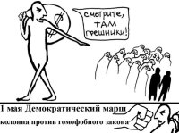 На "Демократический марш за права и свободы граждан и выборность глав регионов" геи, лесбиянки, бисексуалы и транссексуалы Санкт-Петербурга выходят под лозунгом "Мы дискриминацию не выбирали". Именно по нему можно будет найти ЛГБТ-блок, а также, конечно, по радужным флагам! Геи и лесбиянки идут вместе с демократами, чье участие в акции координирует движение "За честные выборы". Рядом будут активисты "Солидарности", "Парнаса", РСДСМ, "Яблока" и других организаций демократического толка.