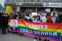 Помимо Москвы и Санкт-Петербурга, заметным стало участие гей-активистов в новосибирской "Монстрации". "У страха глаза велики..." - это радужное полотнище с портретом одного из местных "единороссов", инициатора гомофобного закона, несли гражданские активисты.