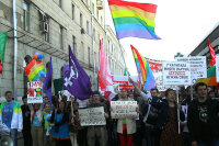 Колонна, в которой московские гей-активисты вышли на Первомай, была немногочисленной. Как сообщают участники, в блоке левых, феминисток, экологов, анархистов и других "альтернативщиков" собралось не более ста человек.