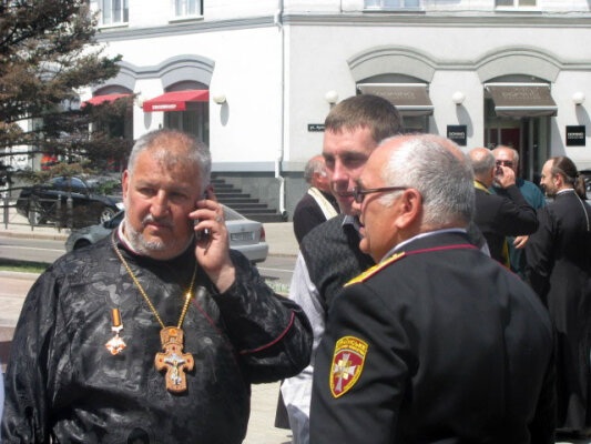 Уже упоминавшийся на Gay.Ru священник Украинской православной церкви Киевского патриархата Сергий, который с помощью интернета насчитал в Верховной Раде 45 геев, повторил на митинге свою мысль. В качестве доказательства он на полном серьезе привел распространенную недавно несколькими "желтыми" сайтами фальшивую новость о том, что заместительница главы администрации президента Украины Ирина Акимова (батюшка по ошибке назвал ее Акимочкиной) якобы вступила в лесбийский брак со своей секретаршей, отправившись ради этого в Амстердам и сняв там по случаю свадьбы дорогой отель.