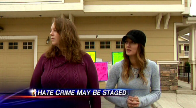 В октябре 2011 года 37-летняя Эми Уайтчерч (Aimee Whitchurch) и 29-летняя Кристель Конклин (Christel Conklin) сообщили в полицию, что обнаружили на двери своего гаража выведенную красным пульверизатором надпись "Убивайте геев" (напомним, что в США словом "gay" называют гомосексуалов обоих полов - и мужчин, и женщин). На следующий день они снова позвонили в полицию, рассказав, что кто-то оставил веревку, связанную в виде петли для виселицы, на ручке входной двери их дома.