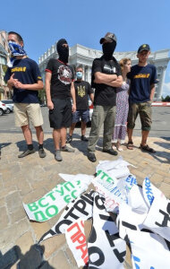 Тем временем в Киеве местные национал-патриоты попытались сорвать очередную протестную акцию гей-активистов, которая была согласована с властями и проводилась перед Министерством иностранных дел страны. Акция носила название "Не нужны дома?" На нее активисты явились с упакованными чемоданами, тем самым дав понять, что собственная страна их не ценит, и что многие гомосексуалы либо вынуждены покидать Украину, уезжая в другие, цивилизованные страны, либо серьезно об этом задумываются. Они также собирались передать главе МИД Константину Грищенко письма от международных организаций, которые осудили направленные против геев инициативы парламента.