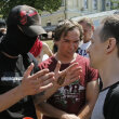 Провести акцию геям и лесбиянкам помешала группа сторонников Всеукраинского Объединения "Свобода" (организации крайне правого, националистического толка), которые в грубой форме требовали от митингующих убираться, угрожали избить и порвали их плакаты. Как отмечает Точка.net, сперва за порядком во время акции следили два милиционера. Потом подтянулась группа "Беркута" (подразделения МВД специального назначения). "Свободовцы", естественно, были в масках: гомофобов вообще отличает то, что свои лица, как ку-клукс-клановцы, они не показывают.