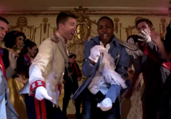 Далее, как и положено по сюжету, на сцене появляется добрая фея-крестная (ее роль исполняет популярная в США комедиантка GloZell), которая отправляет Золушка на бал. И вот тут-то выясняется, что бал этот больше напоминает вечеринку в гей-клубе: приглашенные на него гости - в основном персонажи сказок и диснеевских мультфильмов вроде Аладдина и Пиноккио - интересуются только представителями своего пола. В их числе и сам Прекрасный принц, в роли которого выступает Лэнс Басс. То же самое касается диснеевских принцесс вроде Джасмин и Белоснежки, а также Алисы из Станы чудес, которые все как одна - лесбиянки, исполняющие песню Кэти Перри "Я поцеловала девушку" с текстом: "Prince I don’t want you, bye, I’m gonna kiss the girl" ("Принц, я тебя не хочу, давай, до свидания. Я хочу целовать девушку").