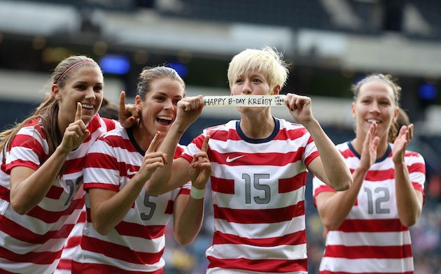 Меган Рапино и ее подруги по команде празднуют забитый гол