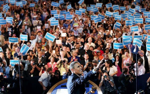 Сам Обама, который был официально назван кандидатом в президенты от партии, часть своей речи на съезде посвятил тому, чтобы бросить вызов консерваторам, которые обвиняют отдельные демографические группы - получателей социальной помощи, профсоюзы, иммигрантов или геев - в создании проблем в стране, вместо того, чтобы мотивировать избирателей на борьбу за равноправие: "Четыре года тому назад на выборах речь шла не обо мне. Речь шла о вас. Мои сограждане - именно благодаря вам произошли перемены. Маленькая девочка с пороком сердца из Финикса - страховая компания не могла покрыть расходы на хирургическое вмешательство, в котором она нуждалась, но она его получит. И это сделали вы. Молодой человек из Колорадо, который никогда не думал, что сможет осуществить свою мечту - получить степень доктора медицины. Теперь у него есть этот шанс. И это сделали вы. Молодой иммигрант, который вырос здесь, здесь ходил в школу и поклялся верности нашему флагу не будет депортирован из единственной страны, которую он называет своим домом. Самоотверженный солдат не будет изгнан из армии лишь потому, что он делит жизнь с человеком, которого любит", - перечислял Обама. Последняя фраза напрямую относилась к отмене политики "Не спрашивай, не говори".
