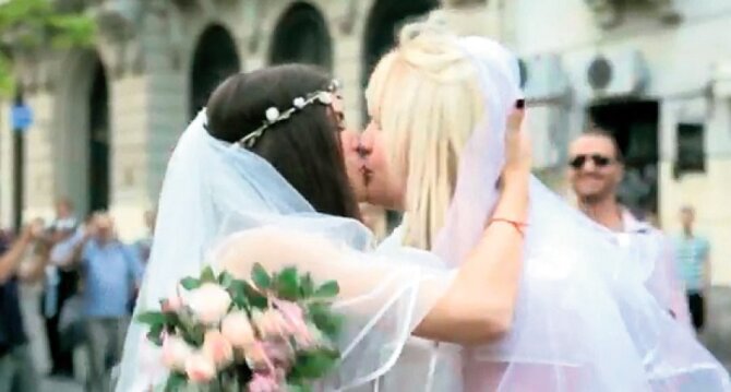 В пятницу на одной из центральных площадей Белграда две девушки в свадебных платьях произнесли судьбоносное "да" и скрепили клятву поцелуем, сообщает сербское издание Kurir.