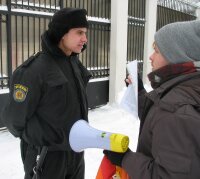 "Когда мы попытались опустить нашу петицию в почтовый ящик посольства, охранник преградил нам путь и не позволил этого сделать. ...Охранник сказал: "Уходите сейчас же". И вторая попытка не увенчалась успехом: на наш вопрос, почему нам не разрешают воспользоваться почтовым ящиком, предназначенным именно для писем и другой корреспонденции, охранник ответил, что вскоре к нам выйдет представитель посольства, которому мы сможем передать петицию. Через несколько минут ожидания мы стали требовать представителя посольства, но никакой реакции не последовало. ...Только после этого охранник сдался, и мы смогли опустить письмо в ящик", - рассказывает участница акции Анастасия Данилова, цитирует ее центр информации "ГендерДок-М".