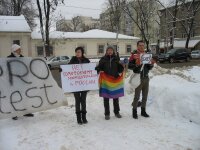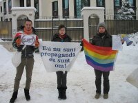 "Мы протестуем в знак солидарности с российскими ЛГБТ-людьми и правозащитниками", "Мы выступаем против любых попыток нарушить права человека в России", "Мы выступаем против ненависти и нетерпимости в России" - с этими и другими требованиями геи и лесбиянки Молдавии пришли вчера к посольству России в Кишиневе, чтобы выступить против законов ненависти. Их Госдума РФ намерена принять на федеральном уровне. Речь идет о запрете так называемой "пропаганды гомосексуализма" среди несовершеннолетних.