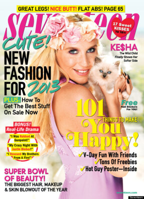 В интервью журналу "Seventeen" американская поп-звезда Кеша (Ke$ha) решила продемонстрировать публике свою "мягкую" сторону. Поэтому сфотографировалась в веночке и с очаровательным котиком на руках, дабы доказать общественности, что она не такая уж девушка-оторви-да выбрось, каковой стремилась казаться на протяжении всей своей непродолжительной, но успешной в коммерческом отношении карьеры.
