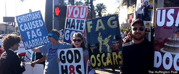 Накануне церемонии вручения Оскаров, которая состоялась в воскресенье вечером, в Голливуд прибыли активисты баптистской церкви Фреда Фелпса из Вестборо. На повестке дня у них стояло все то же: борьба с "пропагандой гомосексуализма", в связи с чем неподалеку от театра "Долби", в котором состоялась церемония, фелпсиане развернули плакаты с традиционными лозунгами "бог ненавидит пид*ров!"