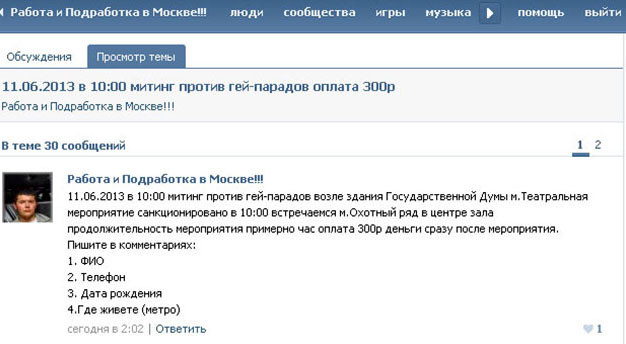 Информация о возможности принять участие в митинге за деньги размещена в соответствующих группах в социальной сети "ВКонтакте". Около 10 человек уже оставили свои данные для организаторов... Другие иронизируют - "Деньги вынесут из Госдумы?". Имя заказчика митинга против ЛГБТ не сообщается, но наблюдатели указывают на то, что той же группой пользуются движения, поддерживающие правящую партию.