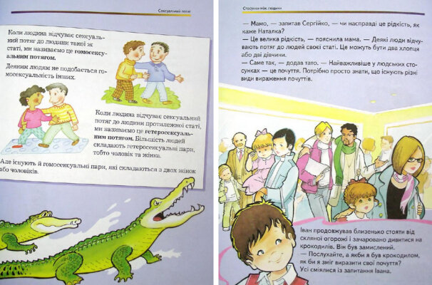 "Когда человек ощущает сексуальное влечение к человеку того же пола, мы называем это гомосексуальным влечением. Некоторым людям не нравится гомосексуальность других. Когда человек ощущает влечение к человеку противоположного пола, мы называем это гетеросексуальным влечением. Большинство людей составляют гетеросексуальные пары, то есть мужчина и женщина. Но существуют и гомосексуальные пары, которые состоят из двух женщин или мужчин.