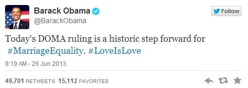 За перипетиями в Верховном суде следила, без преувеличений, вся страна. Многие знаменитости - геи и гетеросексуалы - праздновали победу в своих Твиттерах. Барак Обама также не обошел вниманием это событие в своем официальном Твиттере, снабдив сообщение о падении DOMA хештегом #ЛюбовьЕстьЛюбовь.