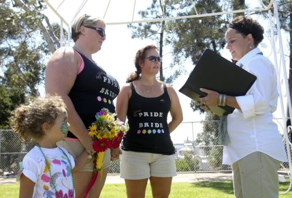 Как пишет U-T San Diego, молодоженами в этот день стали Лиз и Триша Вудли (Liz and Tricia Woodley), которые вместе уже семь лет. Свадьба состоялась прямо под открытым небом, невесты были одеты в простые черные майки с эмблемой прайда и шорты. Матерей сопровождала четырехлетняя дочь пары, Кэрол.
