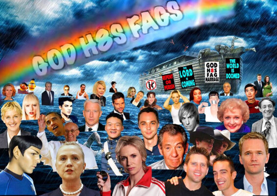 В одном из недавних твитов фелпсиане, внимательно следящие за событиями в мире шоу-бизнеса, возмущались большим количеством номинантов на премию Эмми - геев и лесбиянок, - в числе которых упомянули Закари Куинто и Джейн Линч. По этому поводу они даже разместили фотоколлаж со своим любимым лозунгом "Бог ненавидит пид*ров", на котором изображены известные актеры, музыканты, телеведущие и киноперсонажи-геи, а также их гетеросексуальные союзники. Среди них - Куинто, Линч, Нил Патрик Харрис, Андерсон Купер, ковбои из "Горбатой горы", Адам Ламберт, Рики Мартин, Джим Парсонс, Хиллари Клинтон, Барак Обама и многие другие. Любопытно, что в числе "ненавистных пид*ров" на картинке присутствует Папа римский Франциск, которого фелпсиане, судя по всему, считают сторонником ЛГБТ. Все они тонут в море, в то время как вдаль уплывает библейский ноев ковчег с гомофобными лозунгами на борту.