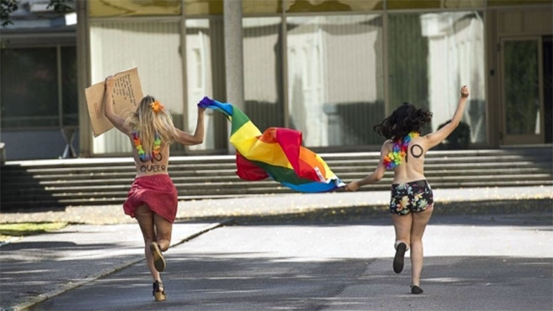 Радужные новостиFEMEN с гей-флагом ворвались на территорию посольства России в Швеции