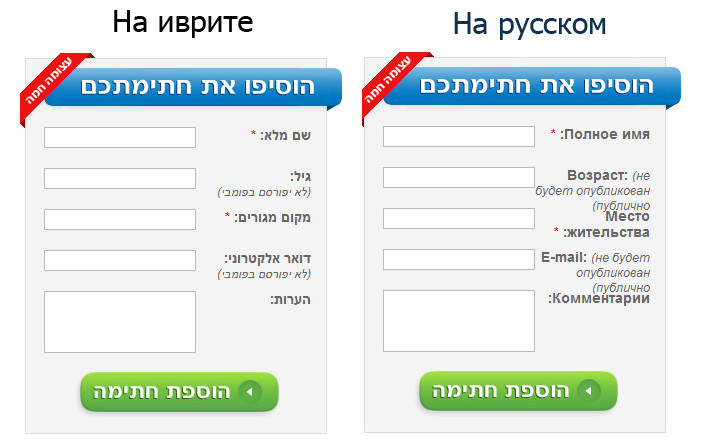 Несмотря на то, что она составлена на иврите, подписать воззвание может любой, вписав свои данные в соответствующие окна с левой стороны страницы (см. перевод на иллюстрации ниже).
