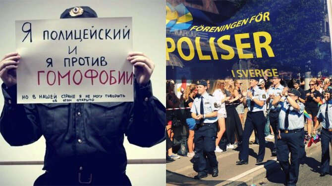 "В то время как в Швеции гомосексуальные полицейские в форме маршируют отдельной колонной на гей-прайде, в российской полиции нет открытых ЛГБТ. Возможно ли это, ведь у нас в стране, как недавно заявил президент, гомосексуалы "продвигаются по служебной лестнице" без всяких ограничений? Тем не менее, о не-гетеросексуальной ориентации полицейского можно узнать только по слухам, и подтверждение этих слухов, скорее всего, будет стоить людям карьеры. Это случилось с Андреем, которому пришлось уволиться после 9 лет службы по причине гомофобной травли на работе. Уволилась и Света, которая публично защитила своего коллегу-гея от издевательств. Оба они сейчас участвуют в правозащитных уличных акциях...", - рассказывают петербургские правозащитники о ситуации в России