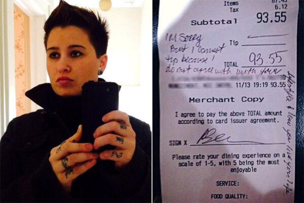 Мы уже рассказывали историю о том, как Дэйна была оскорблена семьей с двумя детьми, которой "не понравился ее образ жизни". Якобы именно поэтому они отказались платить официантке чаевые, внесенные в общий чек. Рассказ Дэйны, который она опубликовала вместе с фотографией чека, стал вирусно распространяться через социальные сети. Моралес писала, что обслуживала клиентов, которые сообщили ей, что "шокированы ее лесбийской стрижкой": "О, а мне показалось, ты сказала, что тебя зовут Дэн, а не Дэйна! Будь уверена, ты нас очень удивила", - цитировала официантка слова матери семейства. Свой рассказ Дейна сопроводила фотографией чека, на котором было написано: "К сожалению, я не могу оставить вам чаевые, потому что я не согласна с вашим образом жизни и тем, как вы этой жизнью живете".