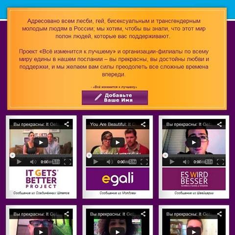 В своей новой акции организаторы It Gets Better призывают людей со всего мира отправлять видеоролики и текстовые сообщения со словами поддержки в адрес российских ЛГБТ-подростков.