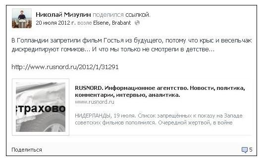 Правозащитникам известно и о гомофобном сообщении, некогда оставленном Николаем Мизулиным в его Фейсбуке в ответ на абсолютно фейковую новость о том, что в Голландии якобы запретили фильм "Гостья из будущего". После того, как эта запись стала достоянием гласности, она была удалена из аккаунта Мизулина, однако скриншоты остались.
