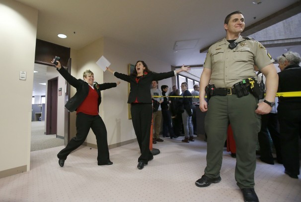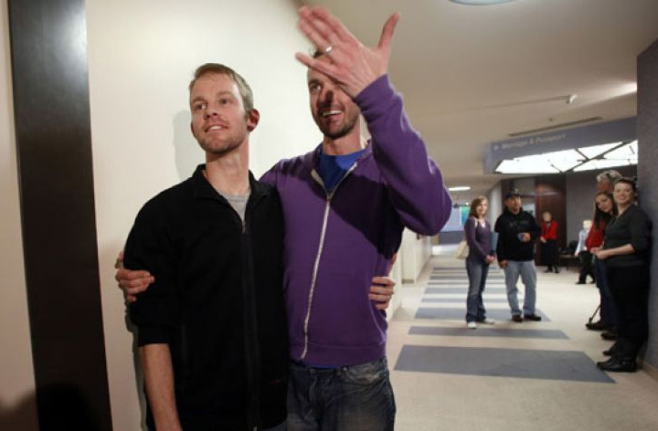 Майкл Адам Фергюсон и Дж. Сет Андерсон (Michael Adam Ferguson and J. Seth Anderson - на фото вверху) были одними из первых, кто узнал о постановлении Шелби, отменившего поправку. Сразу же после этого они отправились в офис регистрации и получили свою лицензию на заключение брака. За ними подтянулись толпы других желающих.