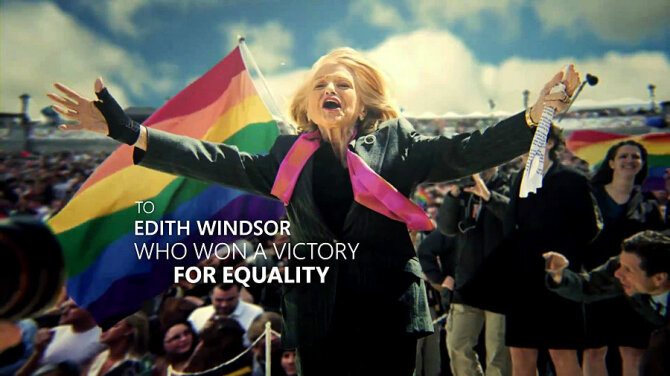 84-летняя Эдит Виндзор (Edith Windsor) войдет в историю гей-движения как женщина, победившая Акт о защите брака. Вдова-лесбиянка из Нью-Йорка подала в суд на федеральное правительство, которое отказывалось признавать заключенный ею брак с Теа Спайер - женщиной, с которой Виндзор прожила более сорока лет. Это привело к тому, что Акт о защите брака (DOMA) был отменен в той части, которая запрещала признание гей-браков на федеральном уровне. Событие стало катализатором для легализации однополых браков в Иллинойсе и Нью-Мексико. Вердикт Верховного суда по делу Эдит Виндзор стал прецедентом, благодаря которым судьи в Юте и Огайо смогли бросить вызов конституционным поправкам, запрещающим однополые браки. В ролике Microsoft отмечается, что Эдит Виндзор "одержала победу в борьбе за равенство".