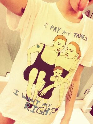 Американская певица и актриса Майли Сайрус (Miley Cyrus) своеобразным образом поддержала права однополых семей, разместив в своем микроблоге фото в футболке с изображением семьи лесбиянок. Это принт из коллекции Марка Джейкобса - известного модельера и открытого гомосексуала.