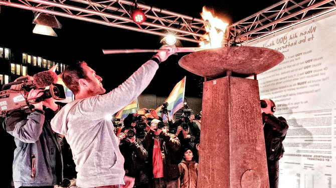 Радужные флаги, 404 воздушных шарика, зажженные свечи, гигантское полотнище - "Остановим гомофобию", сшитое из флагов всех государств, где законодательно преследуют людей за гомосексуальность... Люди пришли на Потсдамскую площадь, где все 16 дней российской Олимпиады в Сочи горел свой огонь - радужный огонь. Днем и ночью его охраняли добровольцы - всего более тысячи человек сменяли друг друга: кто-то после работы, в перерывах, в дождь и снег....