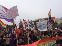 "Трудовые права для всех", "ЛГБТ-активизм - за вашу и нашу свободу!", "Стоп гомофобия!" - эти и другие лозунги видны над колонной ЛГБТ-активистов в Москве, а также радужные флаги и зонты.
