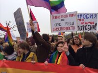 Более 300 человек влились в "Радужную колонну" первомайского Демократического марша в Санкт-Петербурге. "Любовь сильнее войны", "Украина! Бог на твоей стороне", "Все права или только водительские?", "Права не дают! Права берут!", "Петр I ориентировался на Голландию. Это традиция. Продолжим?", "Иисус шел бы с нами!" - эти и другие лозунги несли активисты под флагами Евросоюза, России, Украины и ЛГБТ-движения.