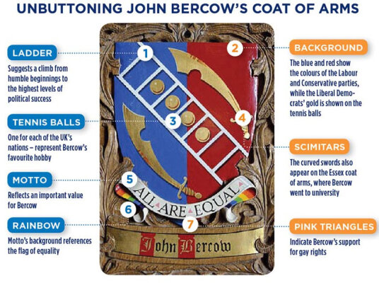 Те, кто получает право на собственный герб, как правило стремятся символически отразить на нем свои увлечения и достижения. К примеру, в 2011 году спикер Палаты общин Джон Беркоу, который не является гомосексуалом, решил напомнить своим гербом в том числе и о борьбе за права ЛГБТ, к которой он приложил немало усилий. Поэтому на нем изображена радужная лента с розовым треугольником в центре и начертанным на ней девизом "Мы все равны".