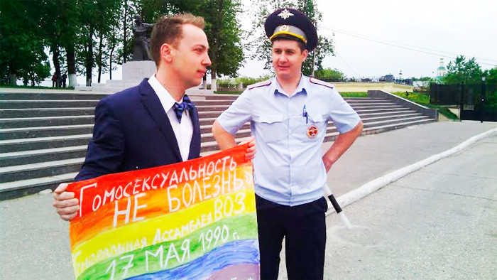 "Радужные флешмобы" в минувшие выходные прошли также в Тюмени, Находке, Самаре, других городах, где обошлось без "контактов" с полицией, обоснованных "законом Мизулиной". В Воронеже полиция не препятствовала короткому "Радужному флешмобу". А вот во Владимире задержала участника одиночного пикета с плакатом "Гомосексуальность не болезнь...".