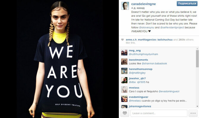 На днях Делевинь выложила фото в свой Instagram, где она запечатлена в футболке с надписью "We are you" в рамках фотопроекта Self Evident Truths ("Самоочевидные истины"). Суть проекта состоит в том, что люди выкладывают в социальные сети свои фото в поддержку тех, которые идентифицируют себя иначе, чем большинство. Об этом сообщает Вe-in.ru.