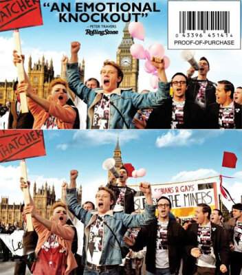 На фото с американского DVD-релиза (вверху) удален баннер "Лесбиянки и геи в поддержку шахтеров"