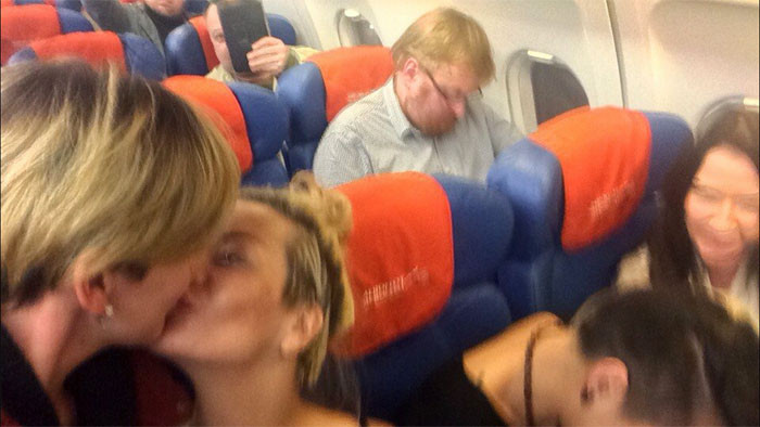 Съемки прошли в салоне самолета, курсирующего между Санкт-Петербургом и Москвой. Фотография, разменная одной из смелых участниц в "Инстаграме", привлекла внимание СМИ. Многие восприняли фото как знак протеста против гомоненавистнической позиции одного из видных представителей правящей в России партии.
