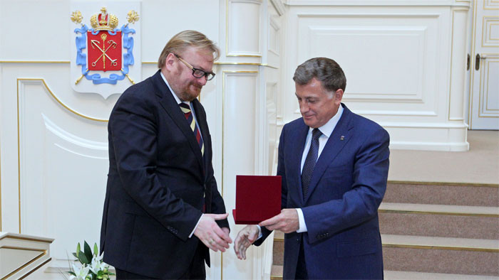 Депутат Виталий Милонов получает почетный знак "За особый вклад в развитие Санкт-Петербурга" и "За безупречную службу Санкт-Петербургу", декабрь 2014 года