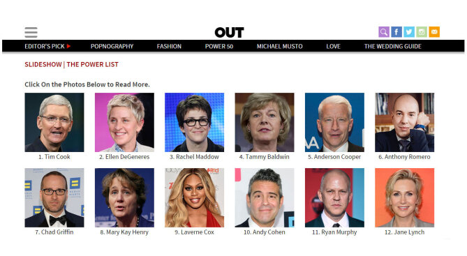 В список Out включает людей из ЛГБТ-сообщества, которые имеют серьезное влияние в той или иной сфере, или пользуются большой популярностью (что тоже смело можно называть влиянием). В прошлом году Тим Кук занял в списке второе место, на первом оказалась Эллен ДеДженерис. На этот раз они поменялись местами, что вряд ли кого-то удивит после публичного камин-аута главы Apple, который является единственный открытым геем в списке Fortune 500. В пятерку также вошли политическая обозревательница Рэйчел Мэддоу, Тэмми Болдуин - первый открыто гомосексуальный сенатор США, а также Андерсон Купер, обозреватель и корреспондент CNN.
