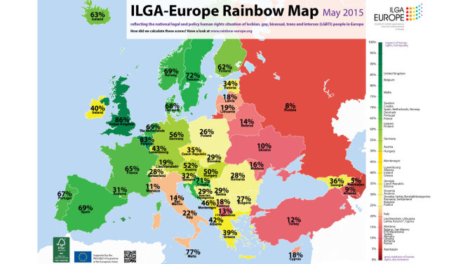Добавим, что впервые "Индекс Радуги" был подсчитан в 2012 году. Тогда Россия вообще оказалась в отрицательной зоне, набрав минус 4,5 пункта. Представление "Индекса Радуги" проходит четвертый год подряд накануне 17 мая, Международного дня борьбы с гомофобией. В этом году интерактивный "Индекс..." размещен на специальном сайте Rainbow-Europe.Org.